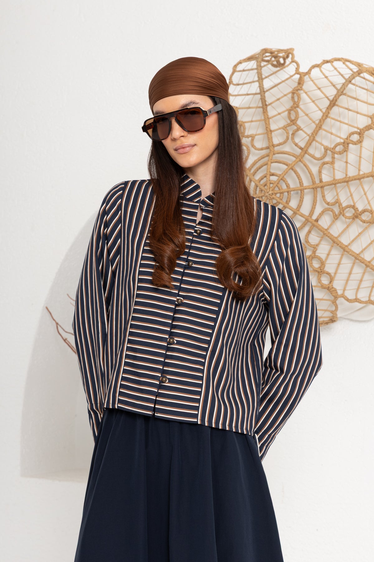 LACİVERT ÇİZGİLİ ÖNÜ BRİTLİ ETEK TAKIM
