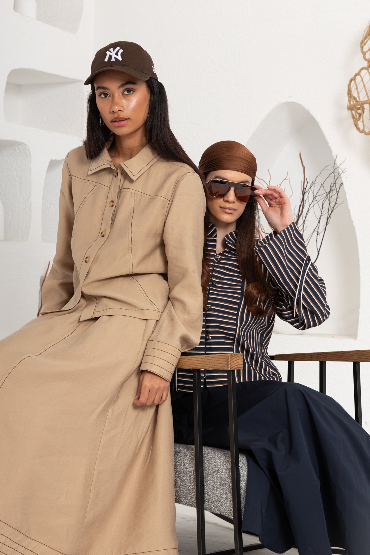 CAMEL ÇİZGİLİ ÖNÜ BRİTLİ ETEK TAKIM