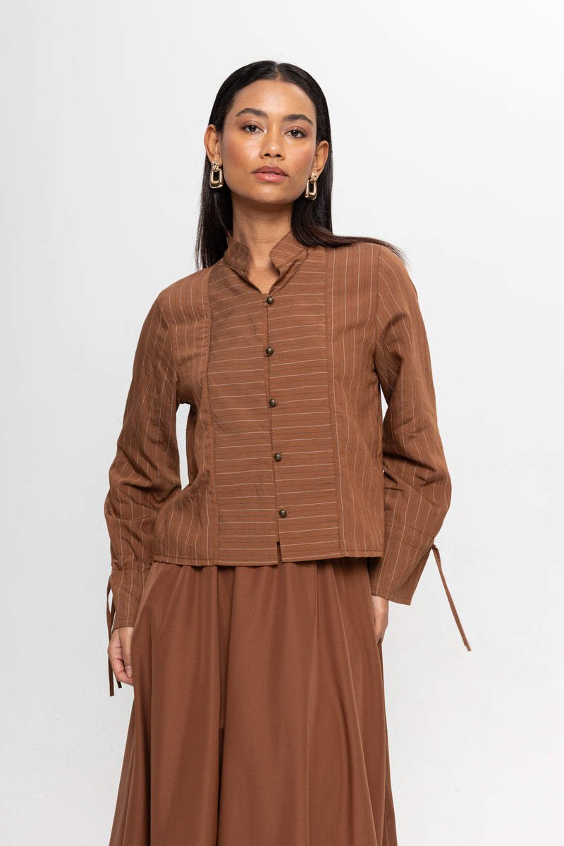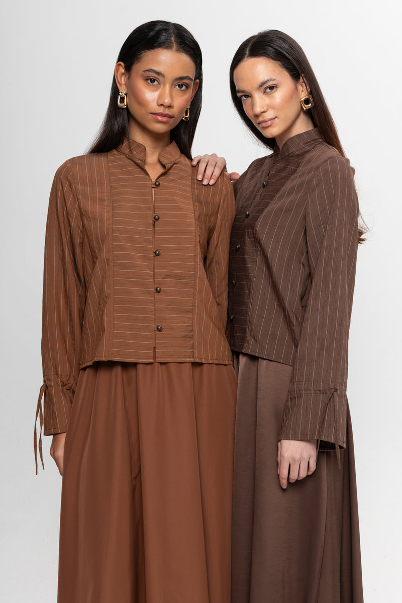 KAHVE ÇİZGİLİ ÖNÜ BRİTLİ ETEK TAKIM