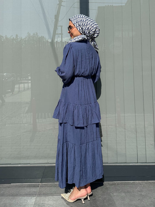 İNDİGO BELİ LASTİKLİ KUŞAKLI ELBİSE