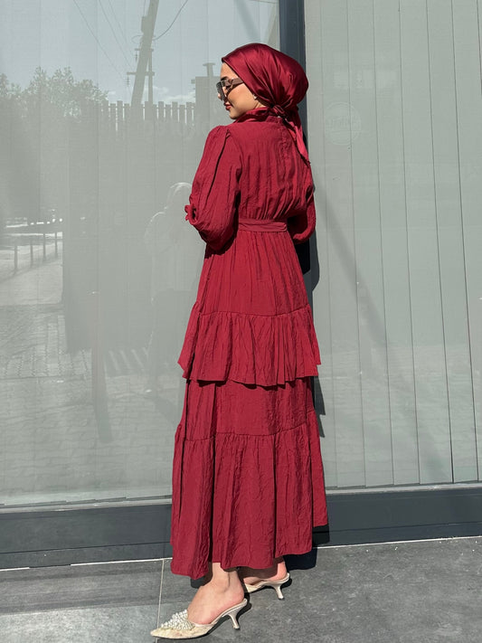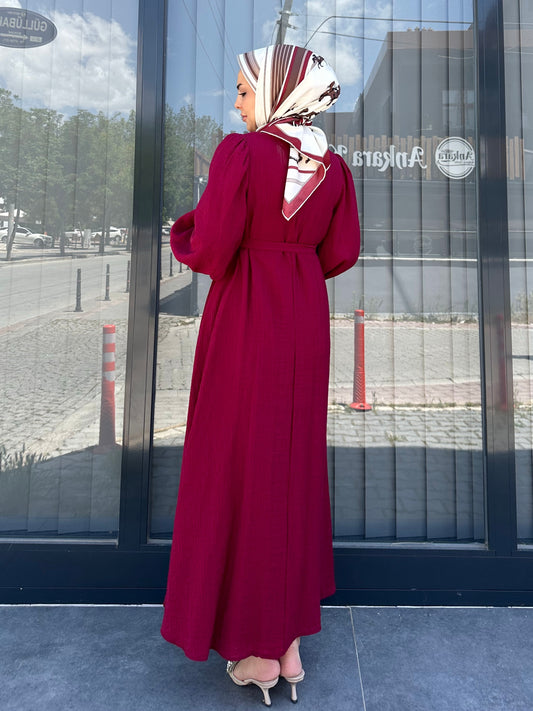 BORDO BELİ LASTİKLİ KUŞAKLI ELBİSE