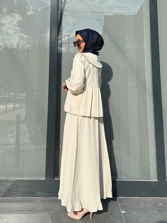 İndirimKREM CEKETLİ KETEN ETEKLİ TAKIM