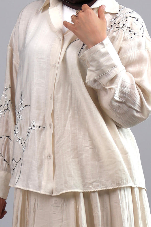 BEJ V YAKA ÖNÜ NAKIŞLI ÇİZGİLİ ETEK TAKIM