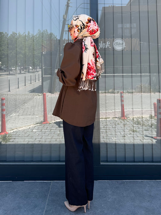 KAHVERENGİ BALON KOL GOLD DÜĞMELİ TUNİK