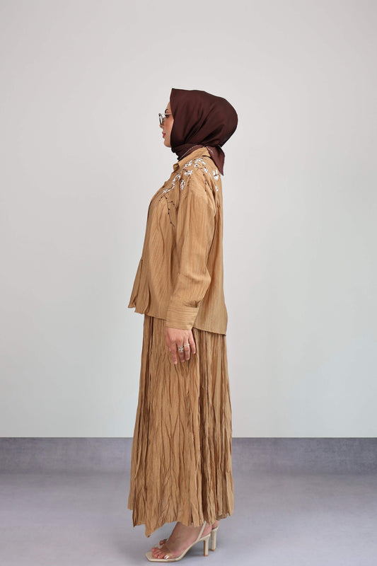 CAMEL V YAKA ÖNÜ NAKIŞLI ÇİZGİLİ ETEK TAKIM
