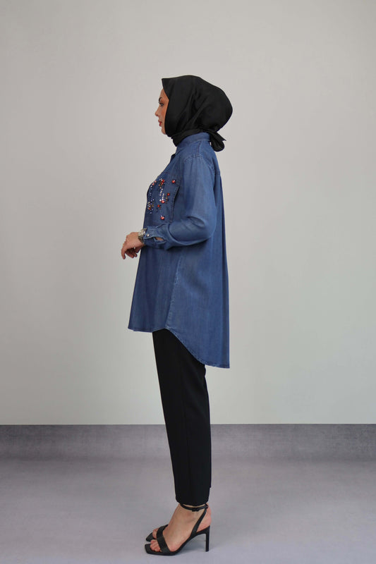 KOYU DENIM RENKLİ TAŞ DETAY TENCEL GÖMLEK