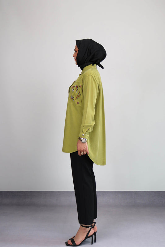 YEŞİL RENKLİ TAŞ DETAY TENCEL GÖMLEK