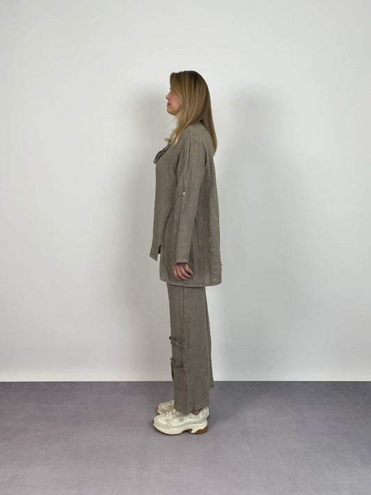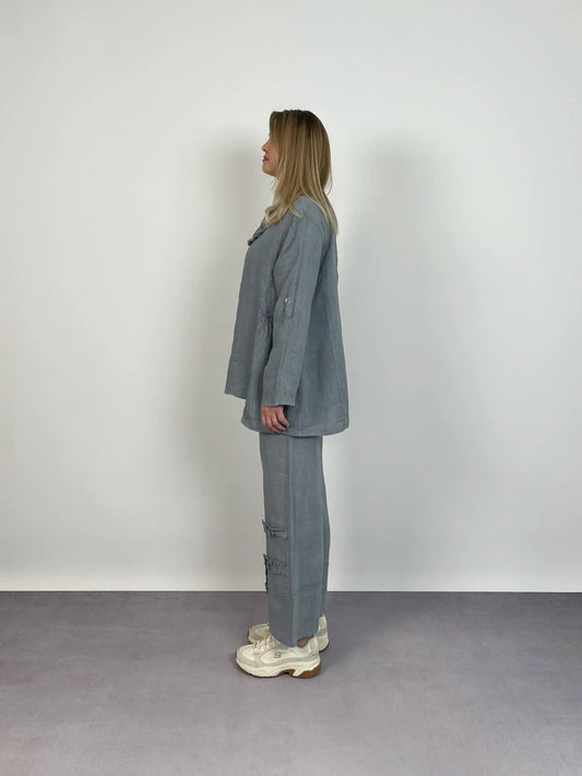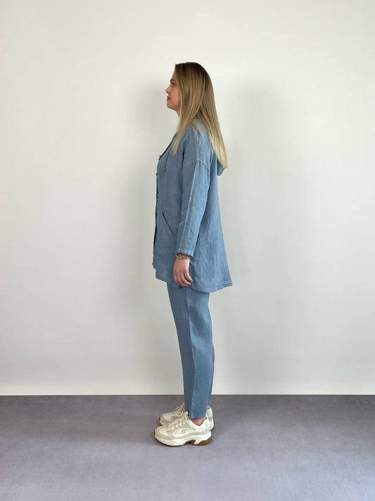 MAVİ DÜĞME DETAY KAPÜŞONLU KETEN TAKIM