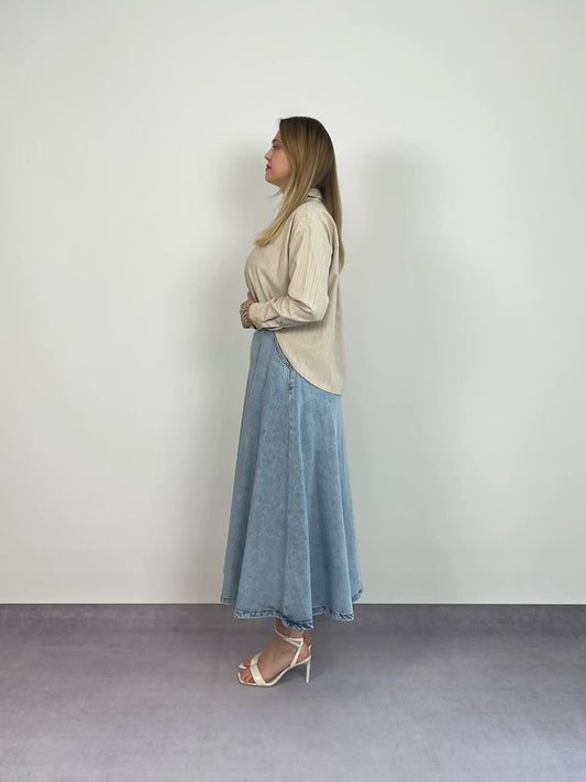 AÇIK DENIM BELİ KEMERLİ UZUN KOT ETEK