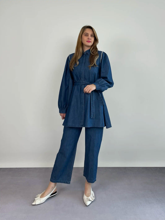 KOYU DENIM OMUZLARI TAŞ DETAY TENCEL KOT TAKIM