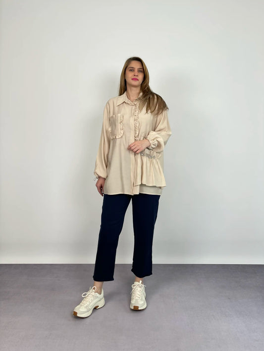 İndirimBEJ FIRFIRLI BONCUK DETAY GÖMLEK