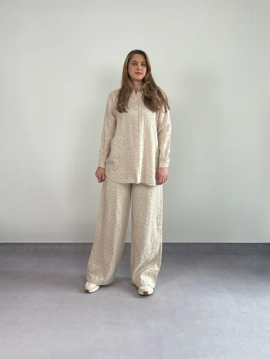 BEJ SERPME TAŞLI KETEN PANTOLON TAKIM