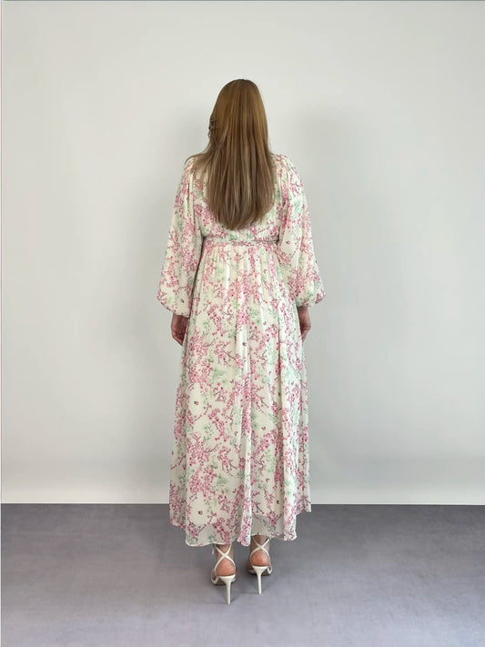 İndirimPEMBE ÇİÇEK DESEN ŞİFON ELBİSE