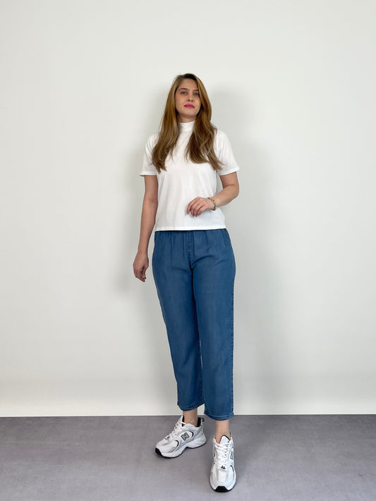 AÇIK DENIM BELİ LASTİKLİ HAVUÇ FORM PANTOLON