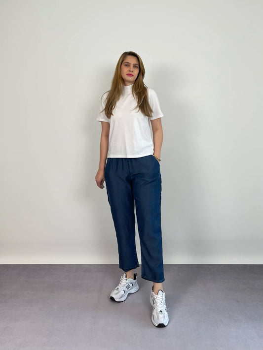 KOYU DENIM BELİ LASTİKLİ HAVUÇ FORM PANTOLON