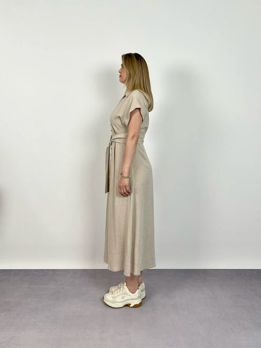 İndirimBEJ KEMERLİ KETEN GÖMLEK ELBİSE