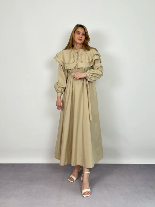 BEJ BRODE ŞERİT DETAY BEBE YAKA ELBİSE