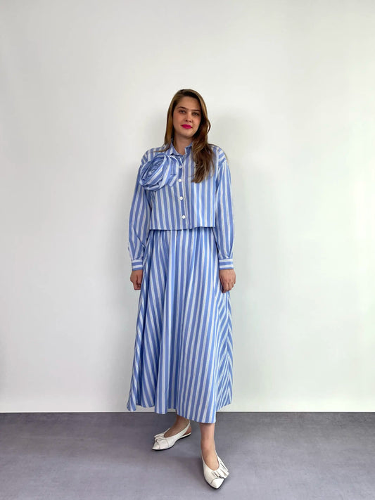 MAVİ ÇİZGİLİ GÜL DETAYLI ETEK TAKIM