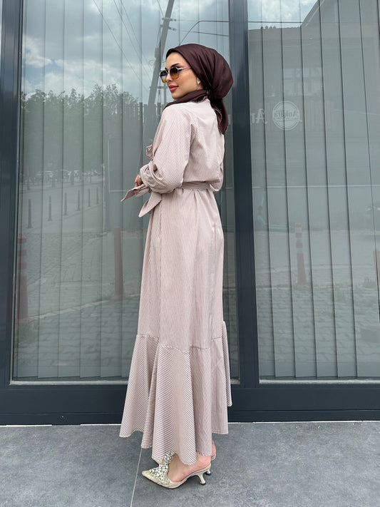 İndirimBEJ KURDELE DETAY ÇİZGİLİ ELBİSE