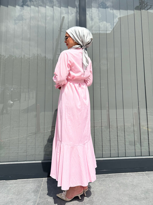 PEMBE KURDELE DETAY ÇİZGİLİ ELBİSE