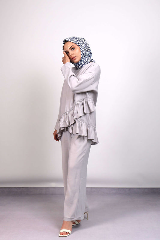 GRİ TENSEL TUNİK VOLANLI PANTOLON TAKIM