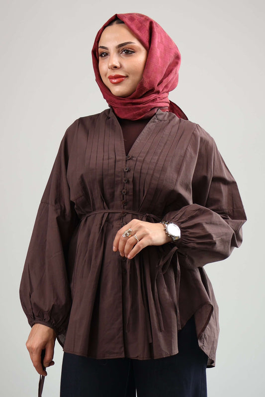 KAHVE DİKİŞ DETAYLI BAĞLAMALI GÖMLEK