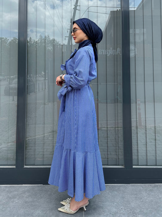 LACİVERT KURDELE DETAY ÇİZGİLİ ELBİSE