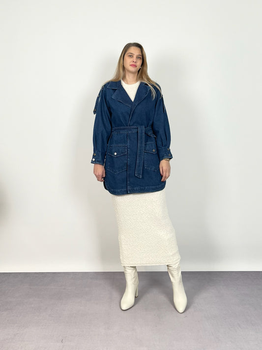 TükendiKOYU DENIM KEMERLİ KISA TRENÇKOT