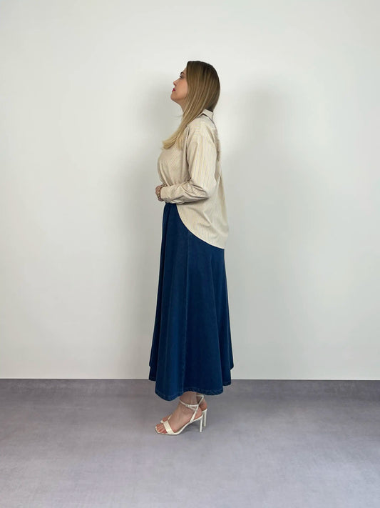 KOYU DENIM BELİ KEMERLİ UZUN KOT ETEK