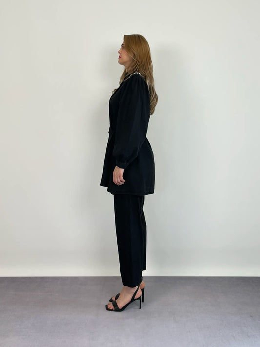 SİYAH OMUZLARI TAŞ DETAY TENCEL KOT TAKIM