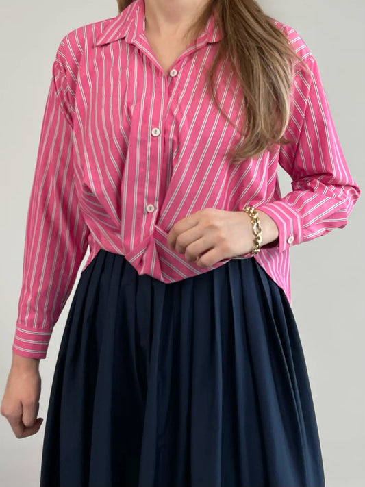 PEMBE ÇİZGİLİ ÖNÜ DÜĞÜM DETAYLI GÖMLEK