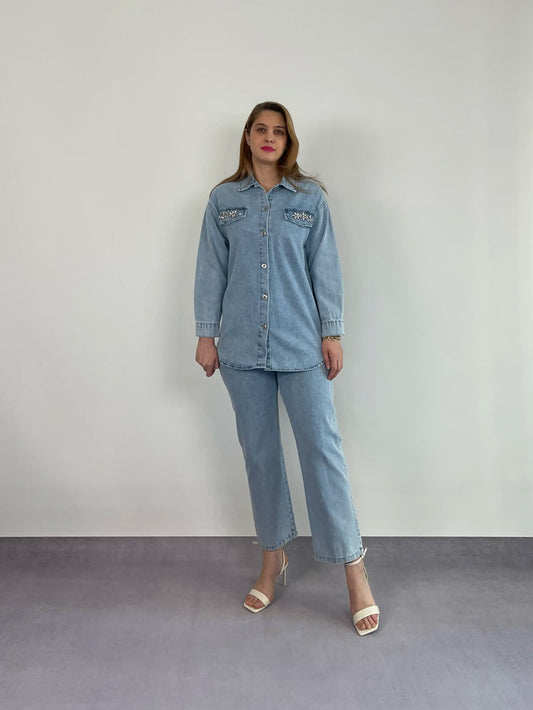AÇIK DENIM TAŞ DETAY GÖMLEK TAKIM