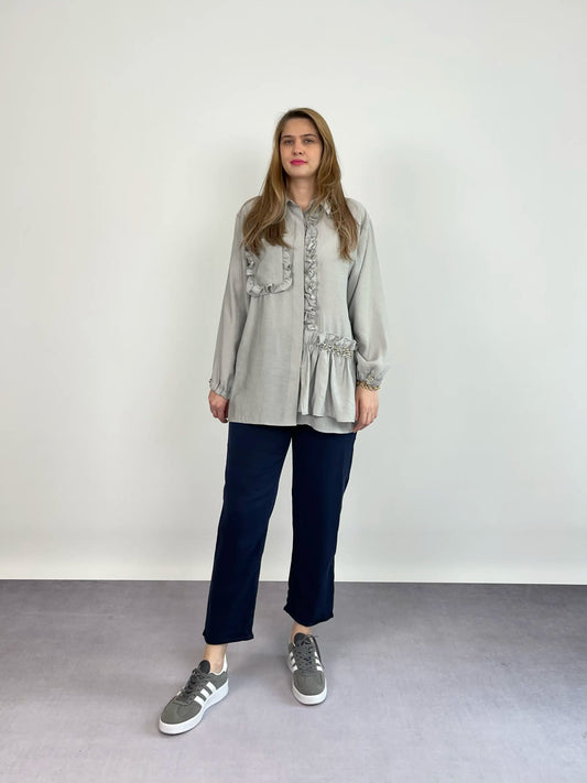 TükendiGRİ FIRFIRLI BONCUK DETAY GÖMLEK