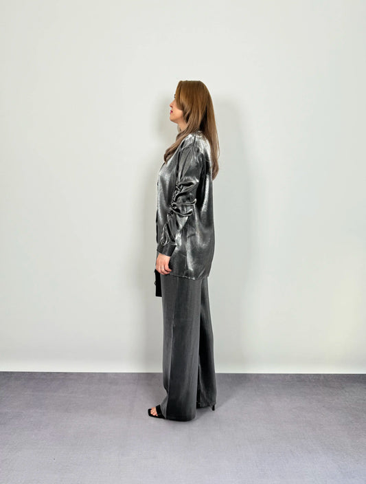 GRİ PARLAK YAKASI TAŞ DETAYLI GÖMLEK