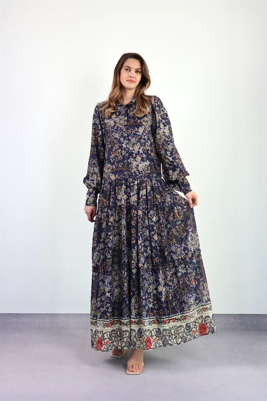 TükendiLACİVERT ÇİÇEK DESENLİ ELBİSE