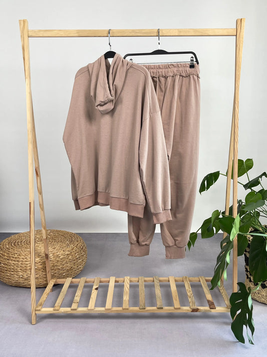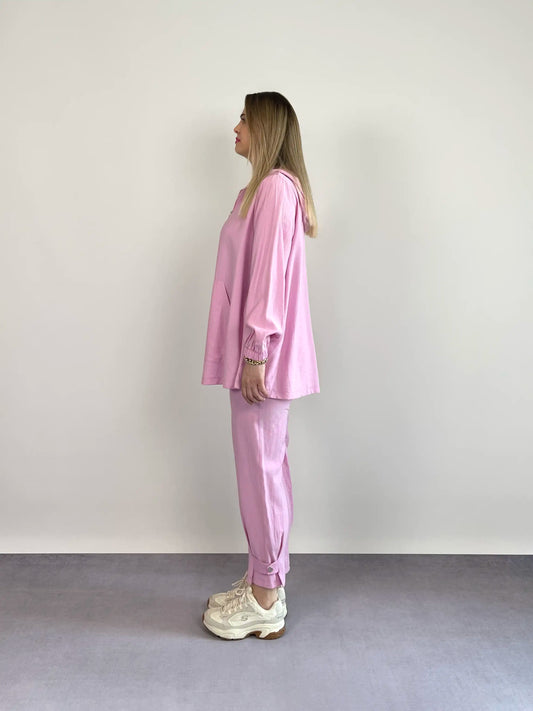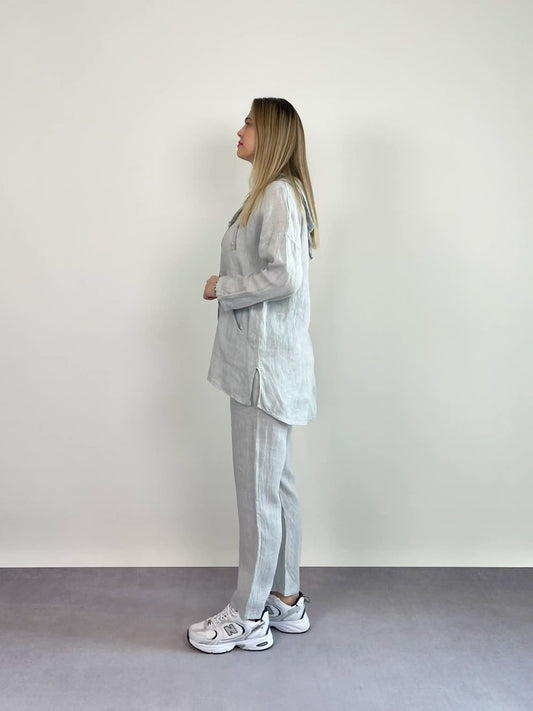 GRİ DÜĞME DETAY KAPÜŞONLU KETEN TAKIM