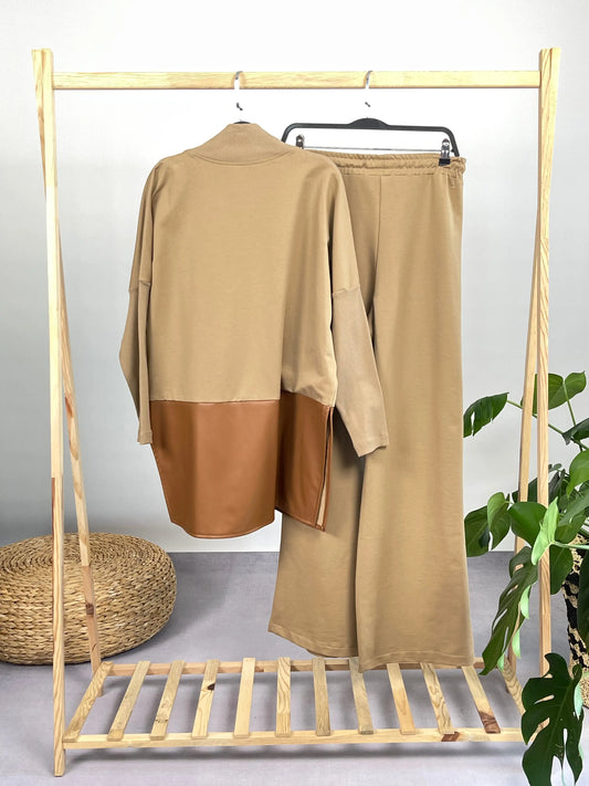 TükendiCAMEL DERİ DETAY PANTOLON TAKIM
