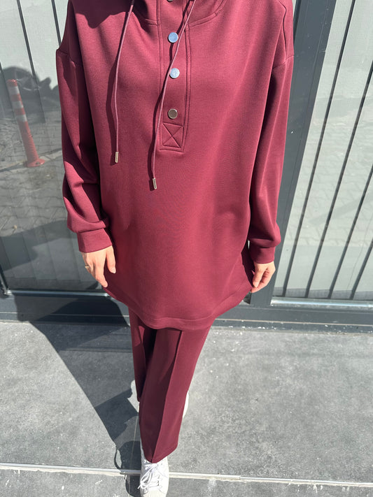 BORDO ÖNÜ ÇITÇIT DETAYLI YÜKSEK YAKA PANTOLON TAKIM