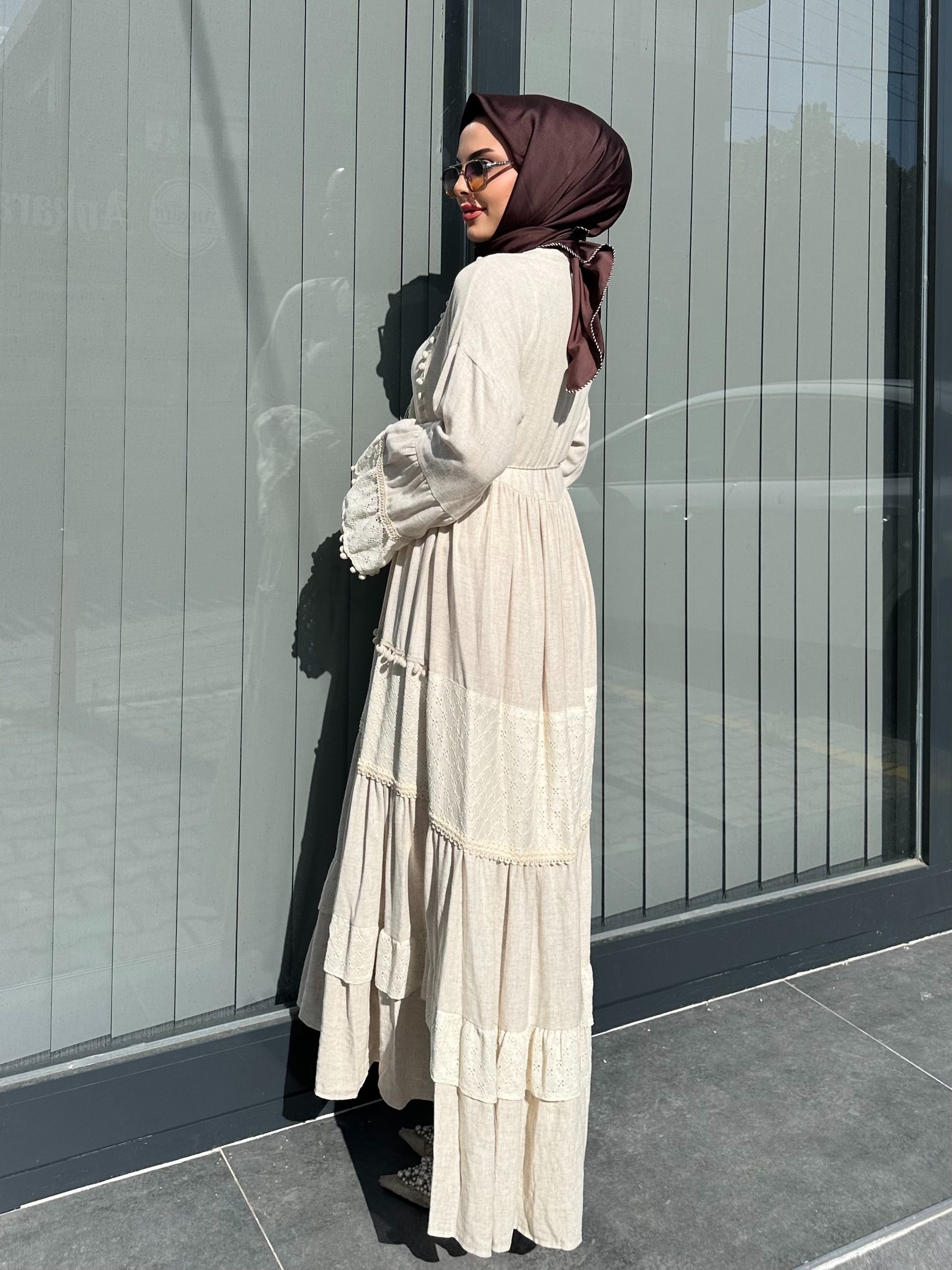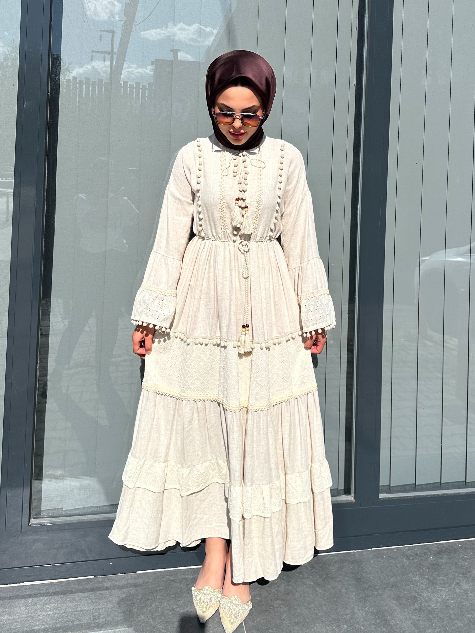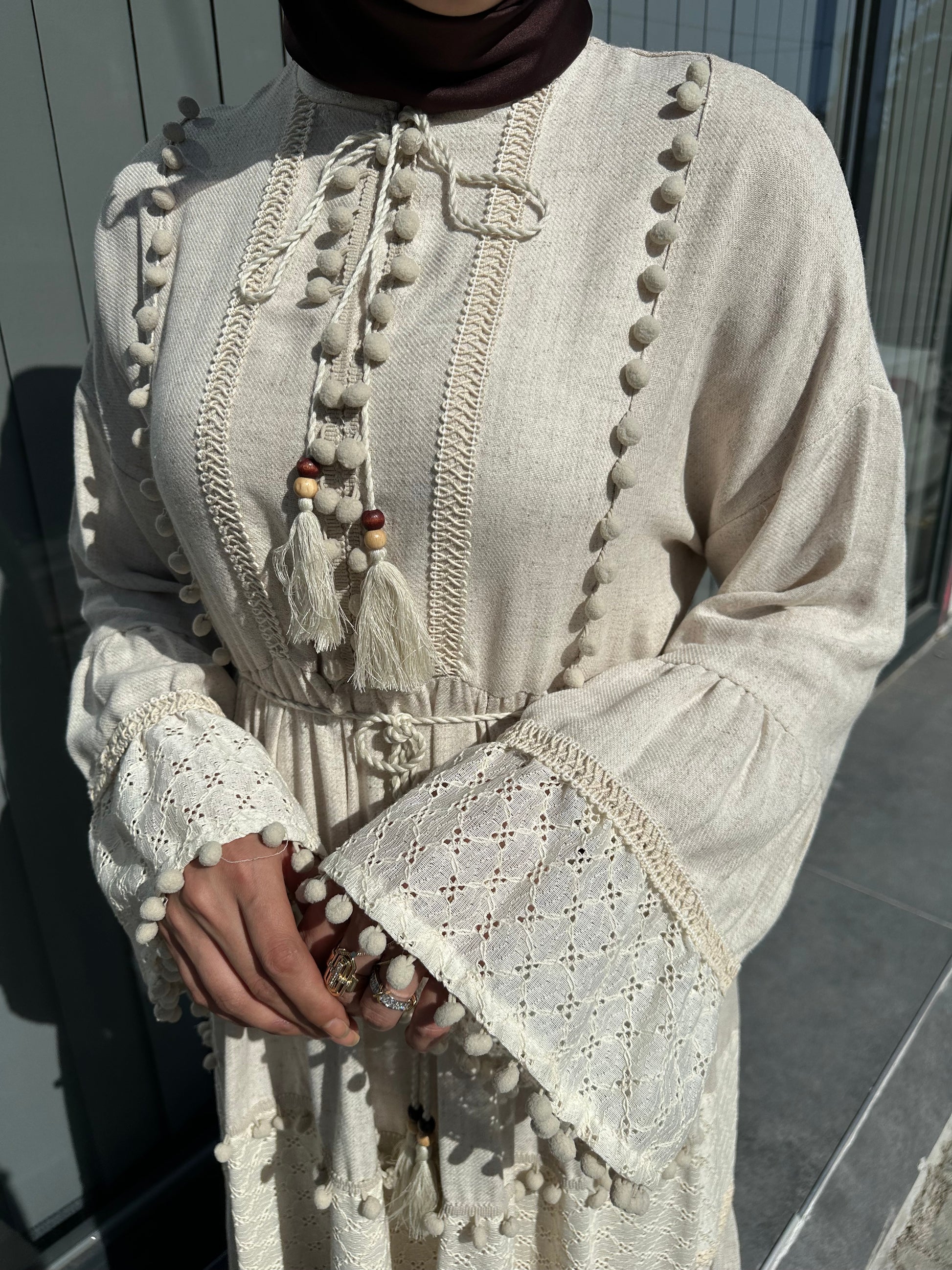 BEJ ETEK UCU PONPONLU ELBİSE