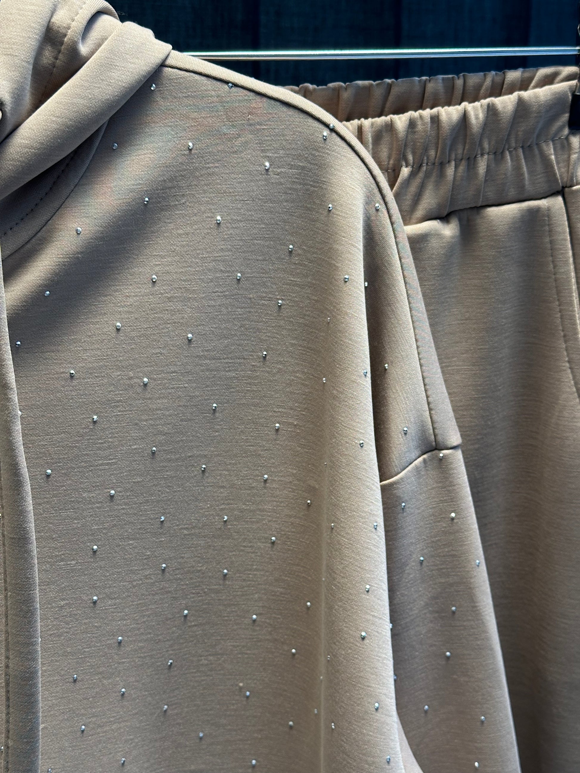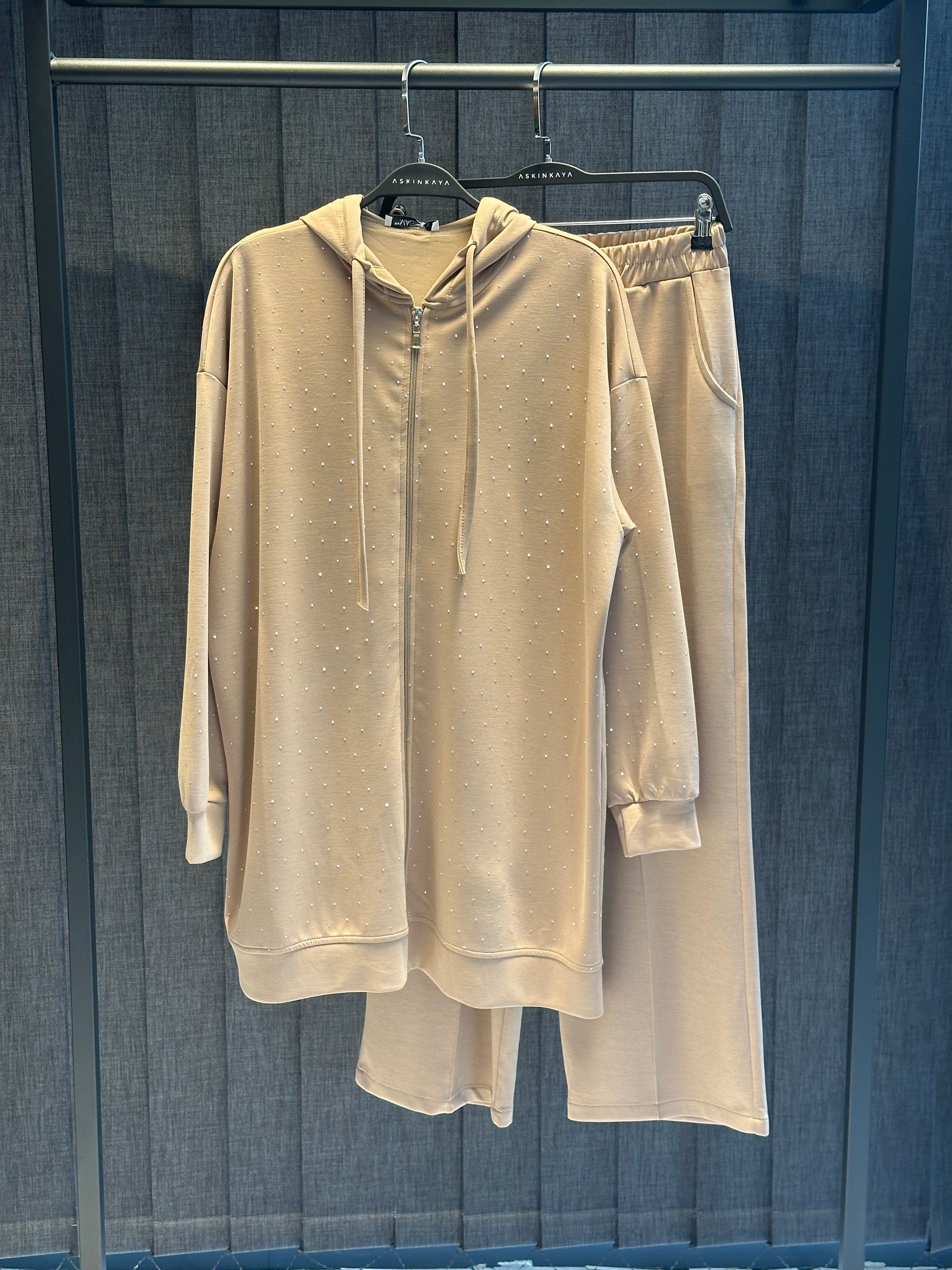 BEJ ÖNÜ TAŞLI FERMUAR DETAYLI PANTOLON TAKIM