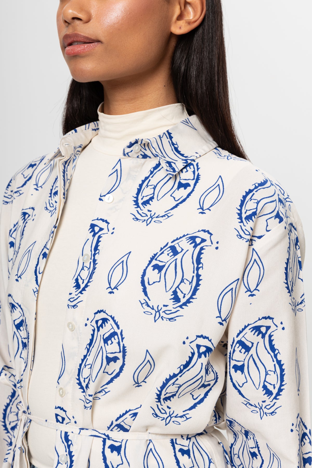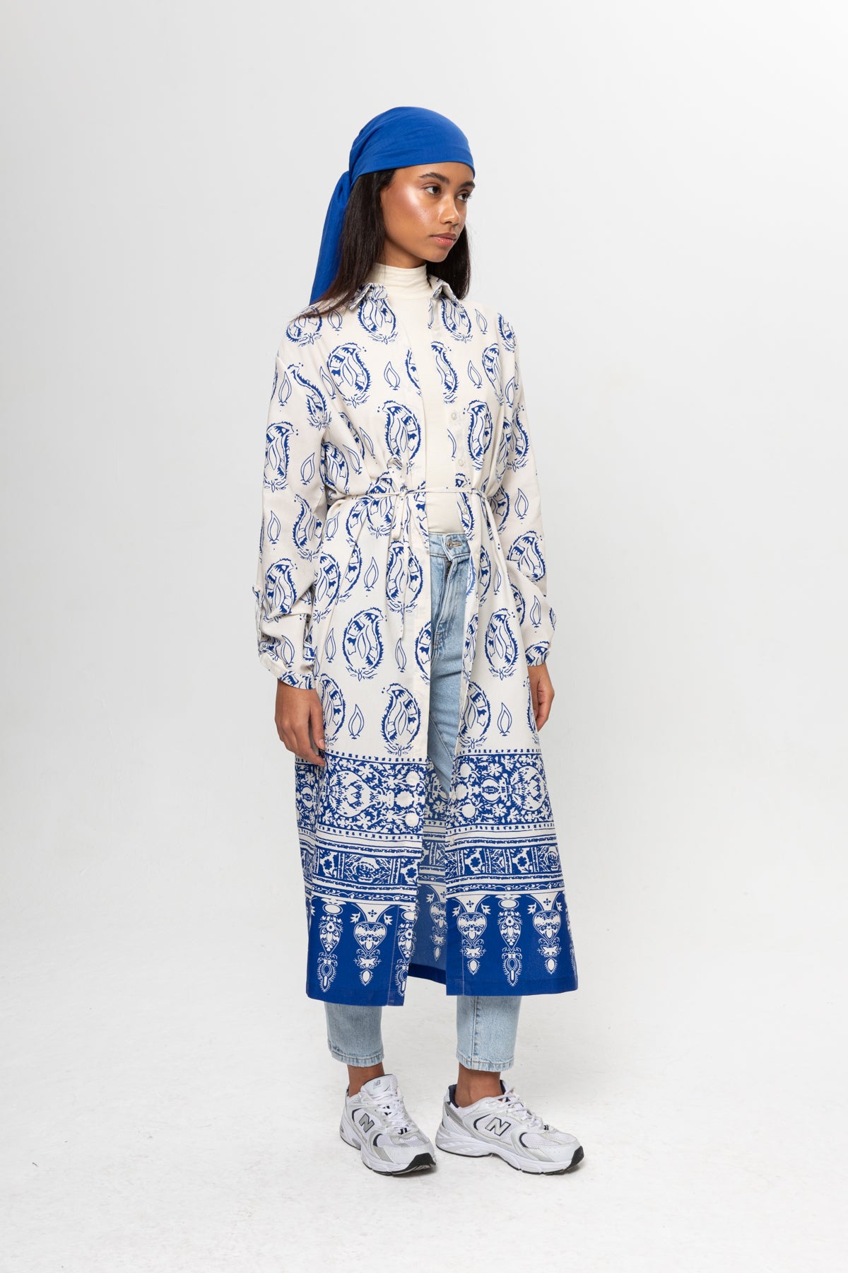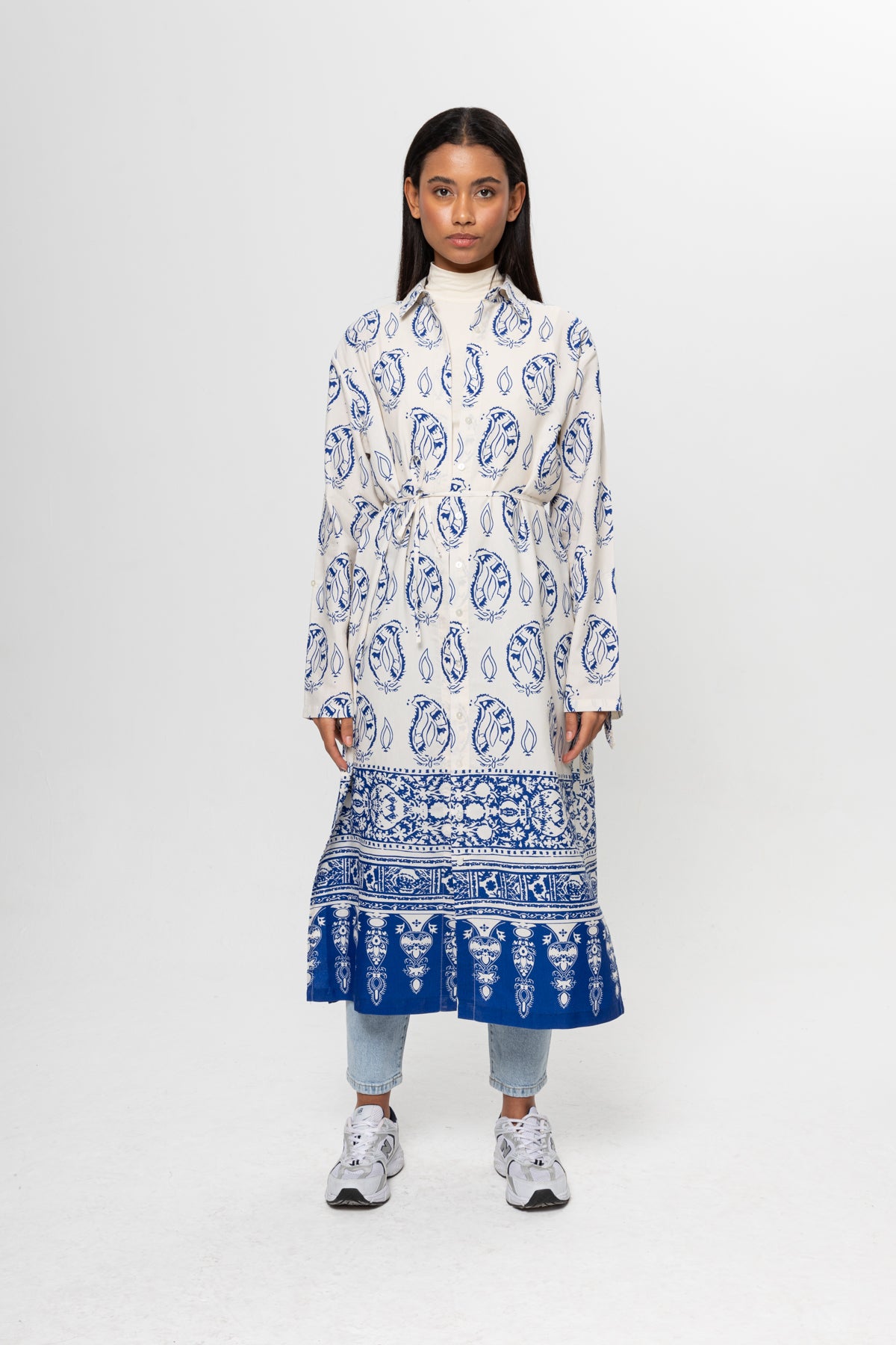 BEJ SAKS MAVİSİ DESENLİ GÖMLEK ELBİSE