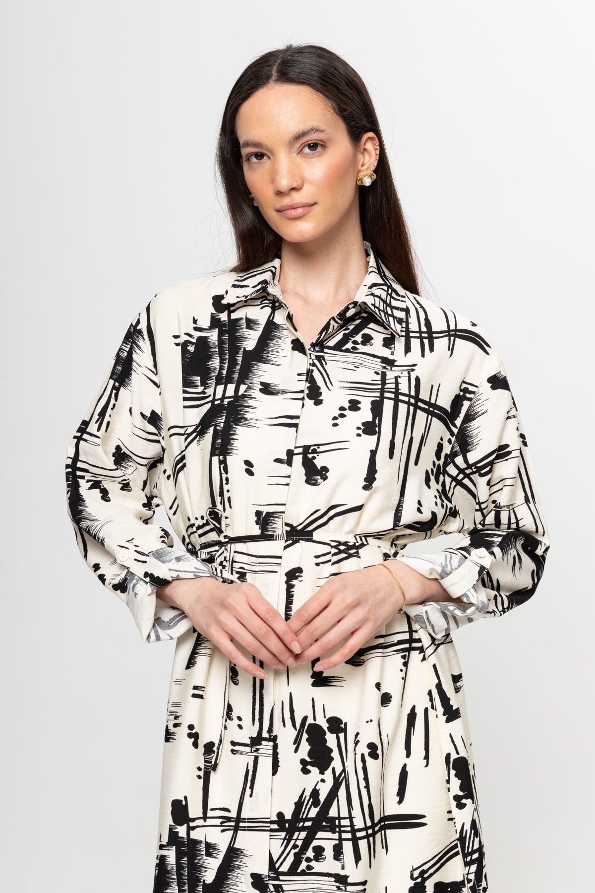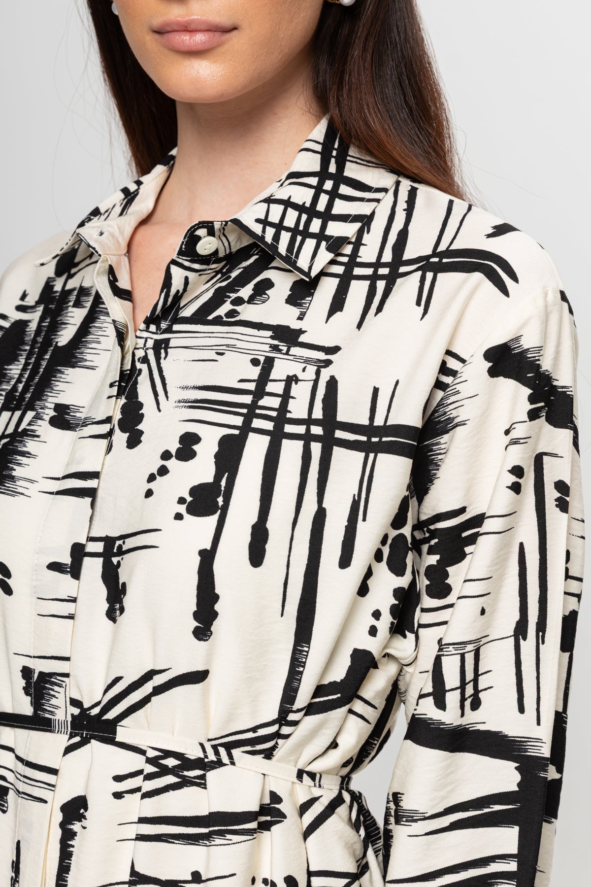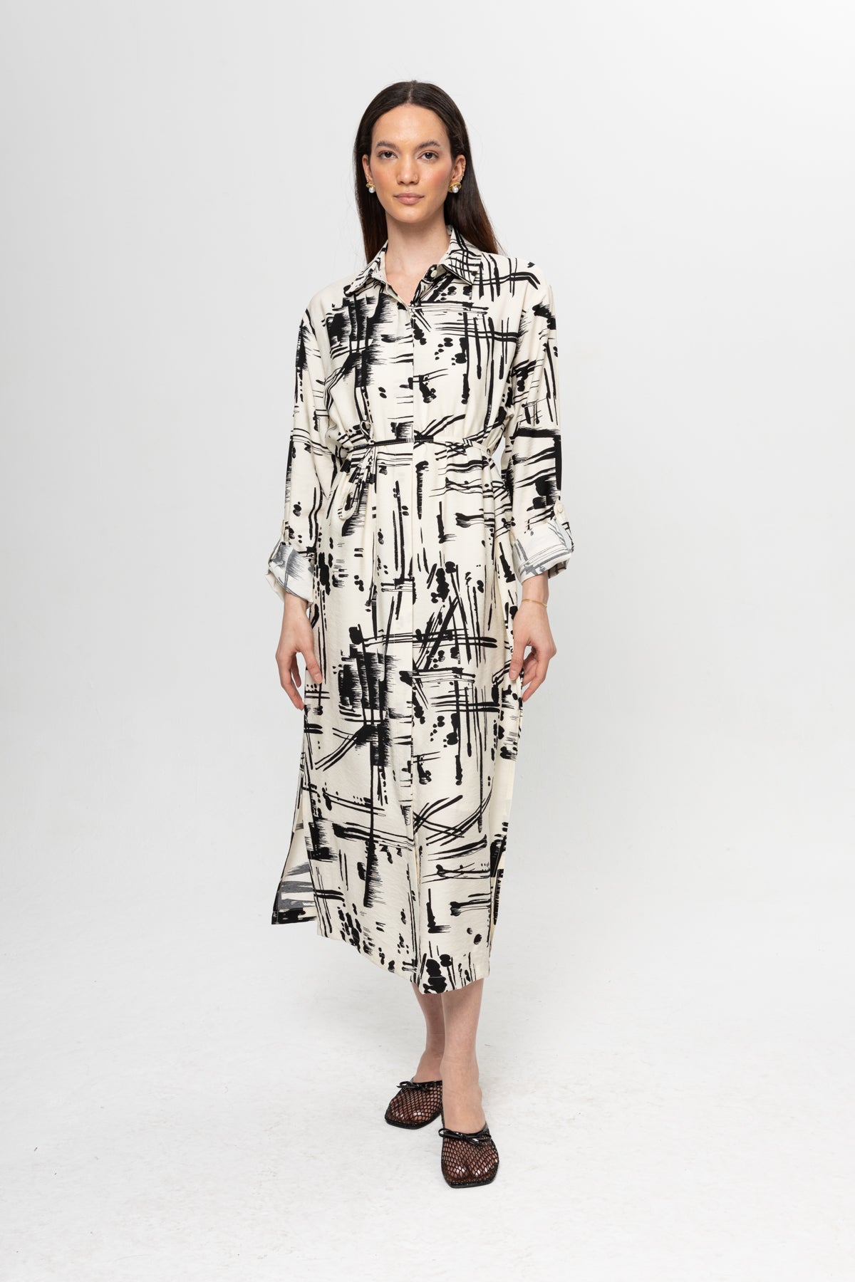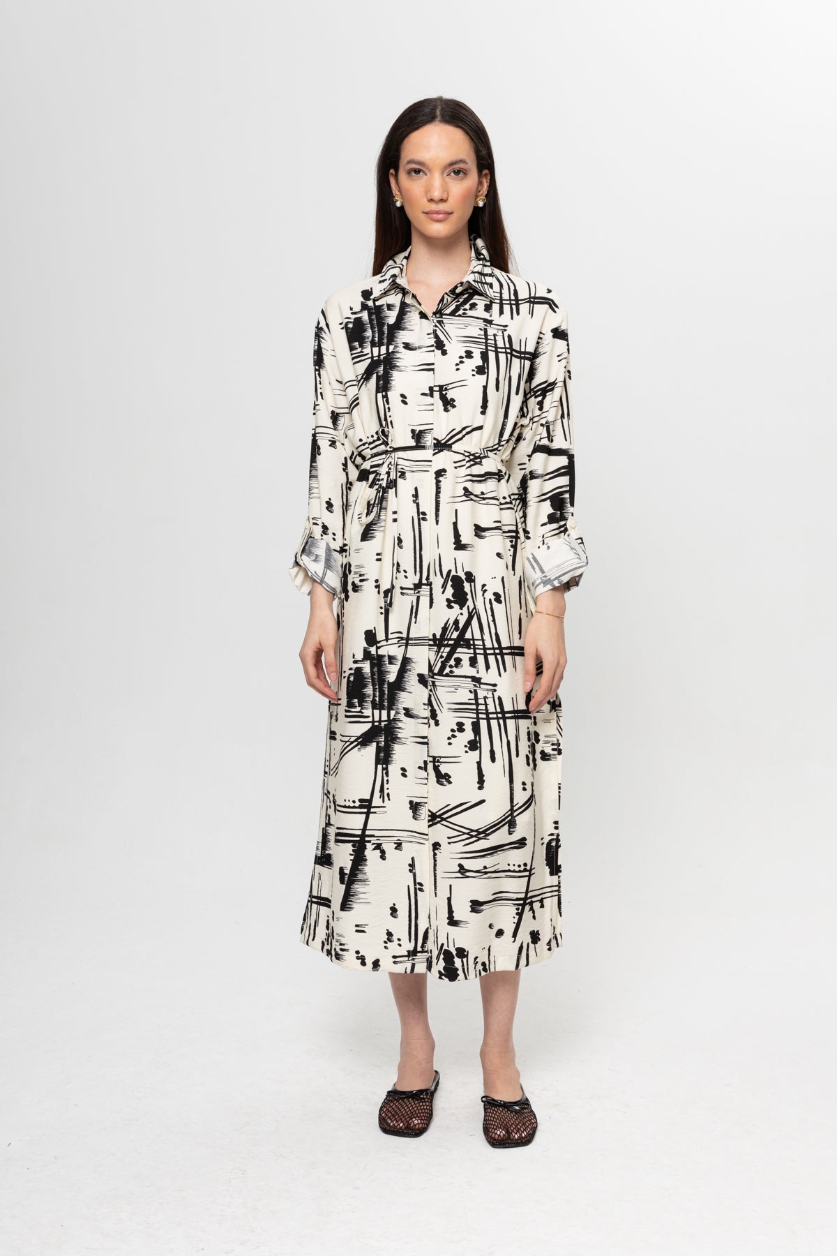 BEJ SİYAH KARIŞIK DESENLİ GÖMLEK ELBİSE