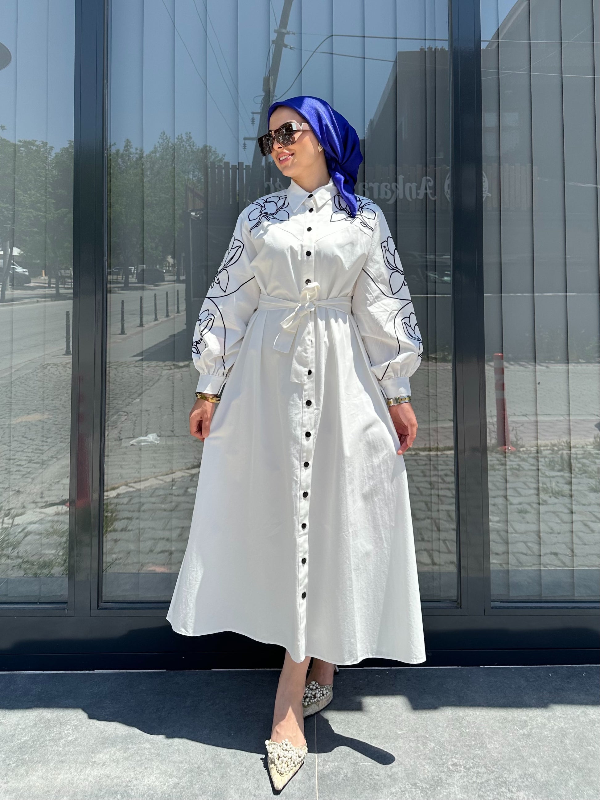 BEYAZ ÇİÇEK İŞLEMELİ ELBİSE