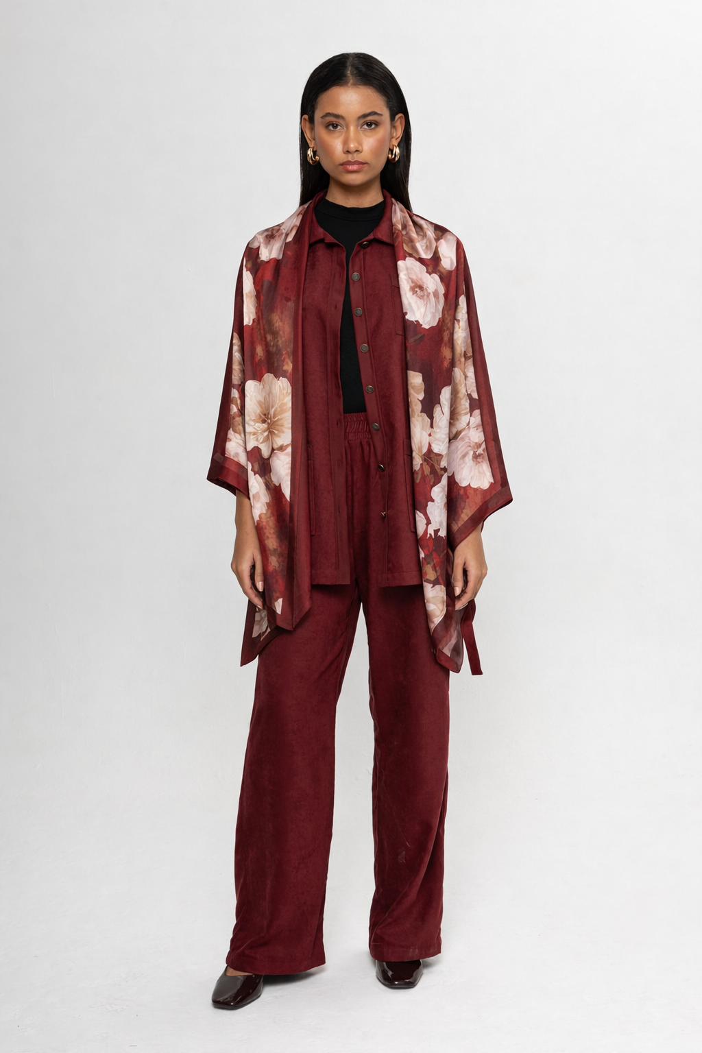 BORDO ÇİÇEK DESENLİ ŞAL