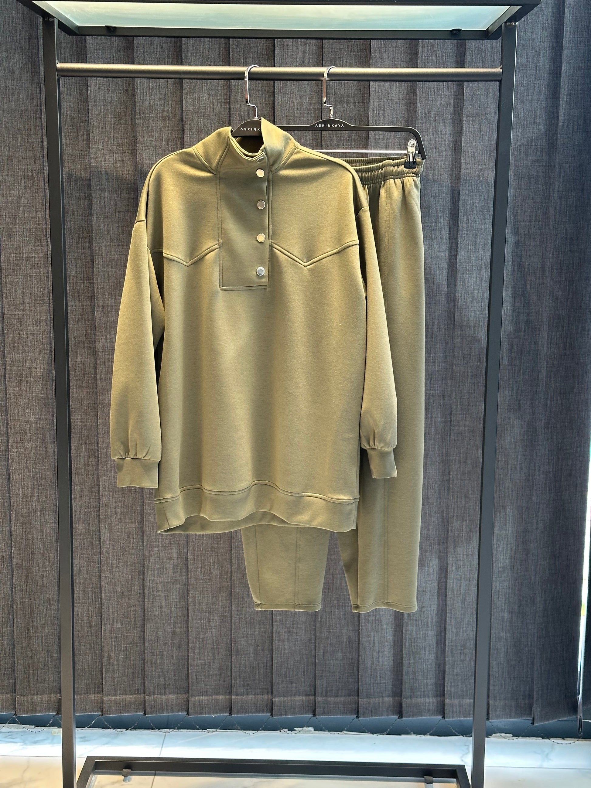 HAKİ ÇITÇITLI YÜKSEK YAKA VE KESİK DETAYLI PANTOLON TAKIM