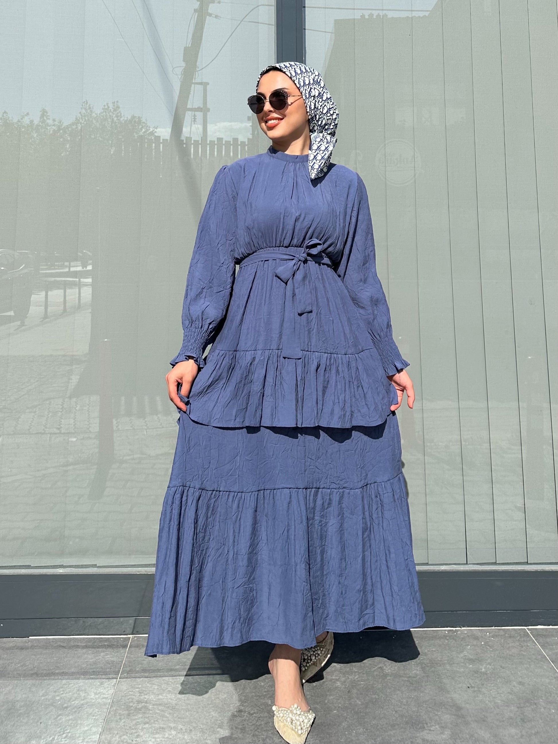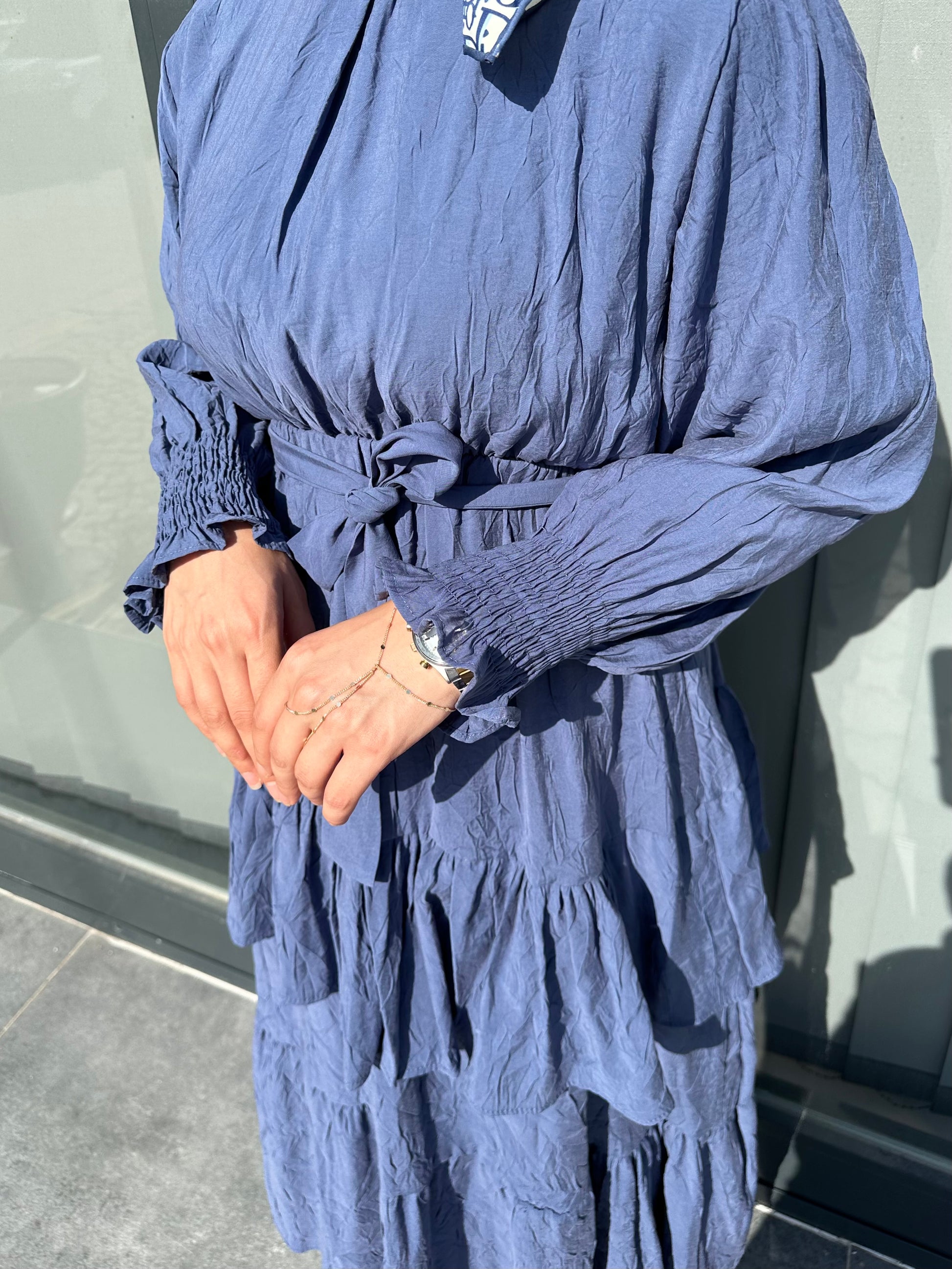 İNDİGO BELİ LASTİKLİ KUŞAKLI ELBİSE