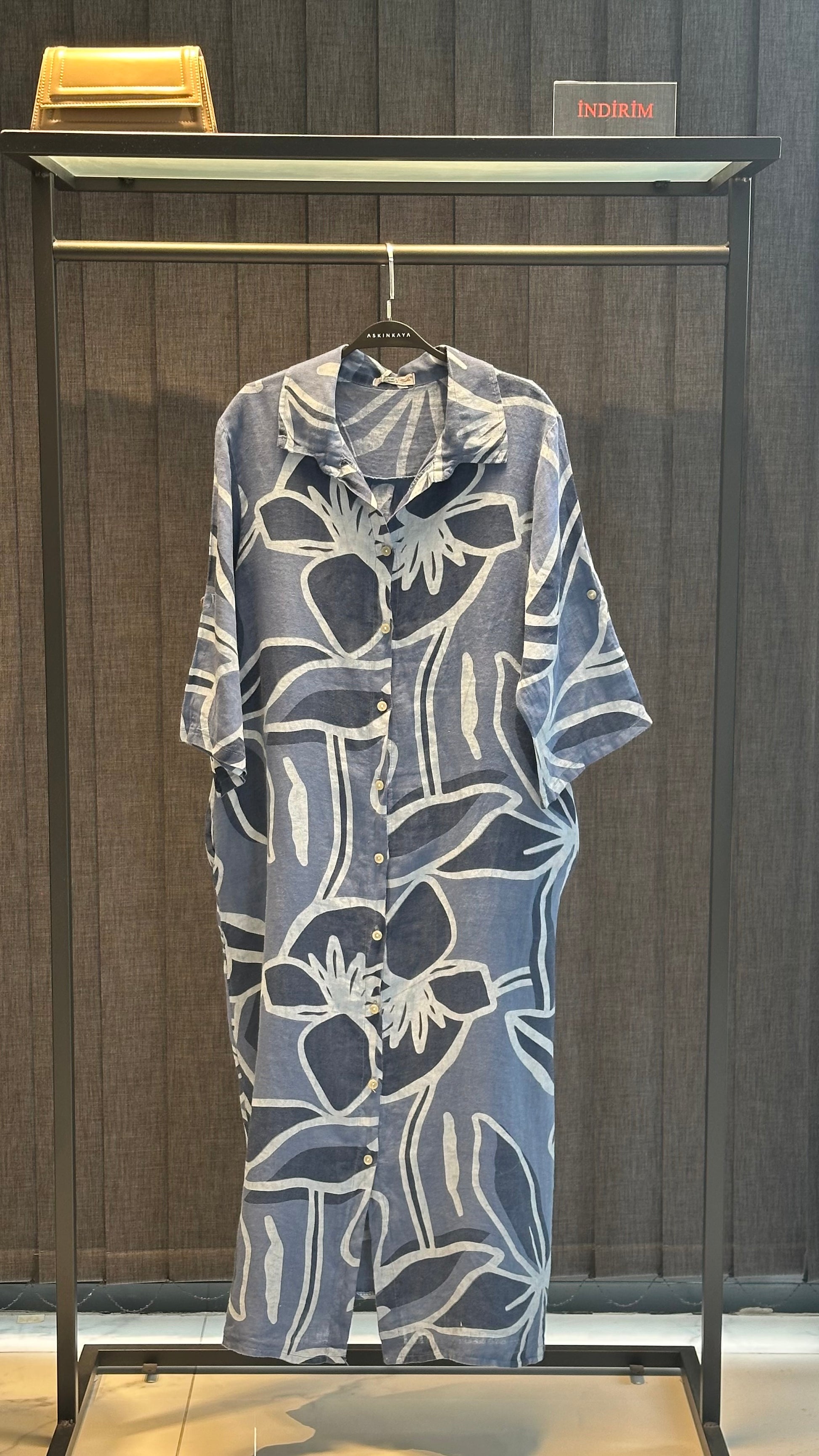 İNDİGO TASARIM DESEN UZUN KETEN ELBİSE