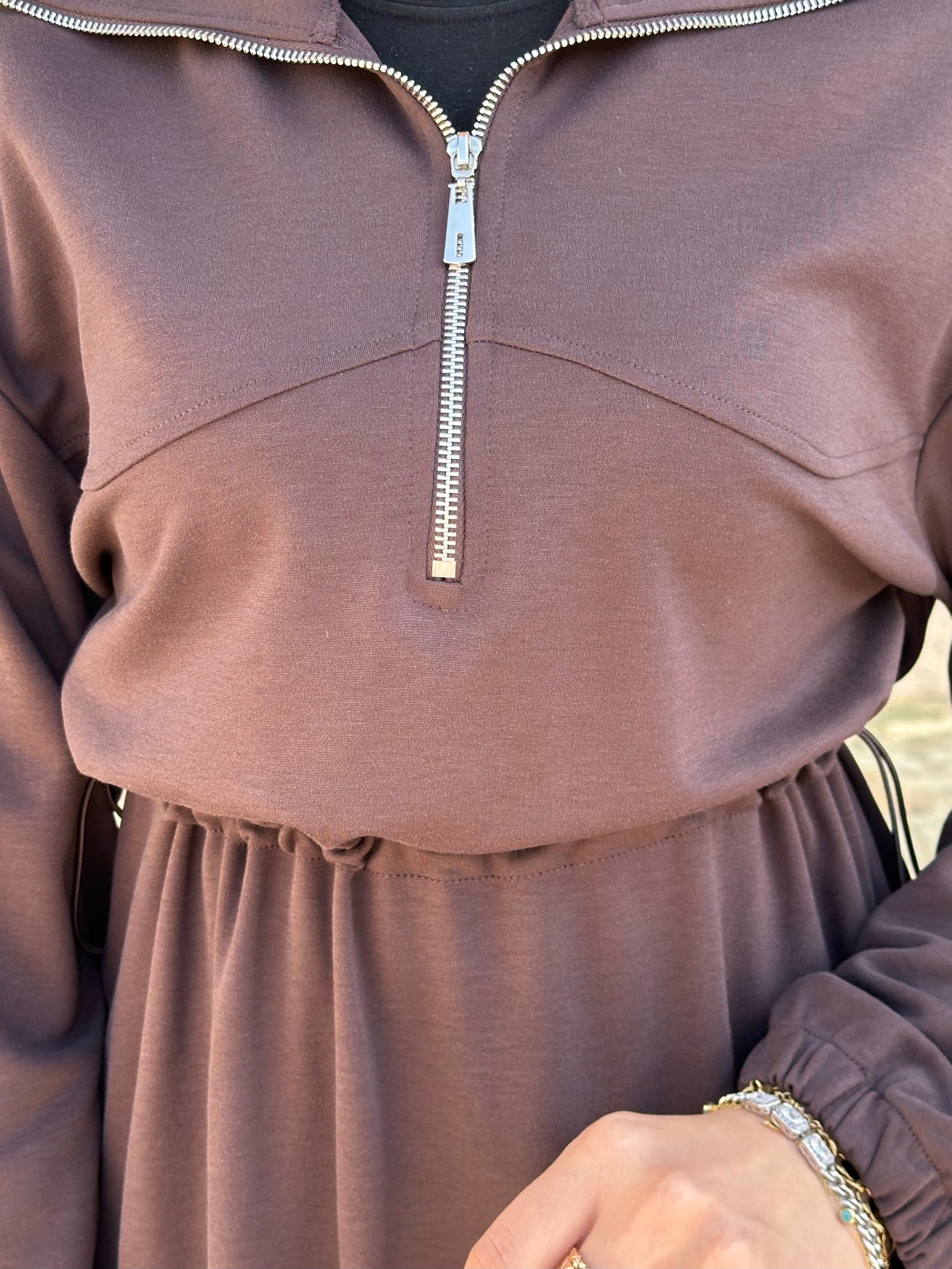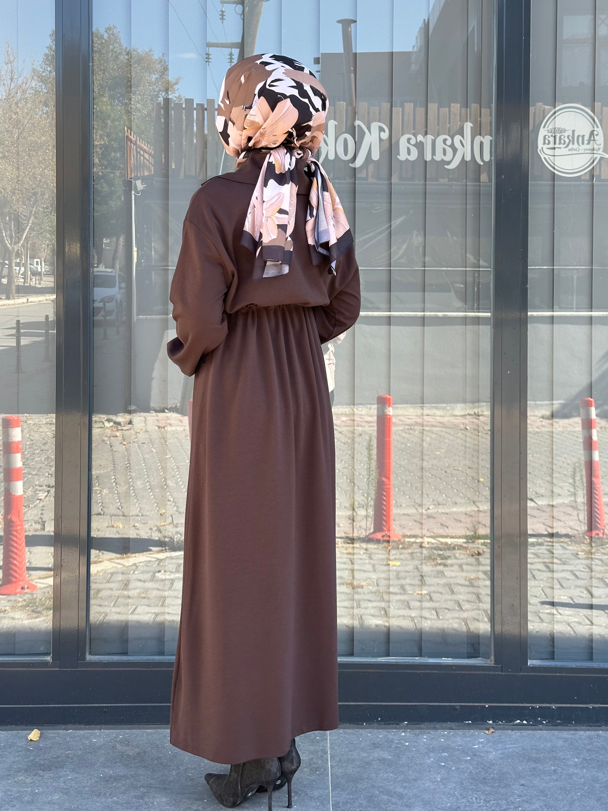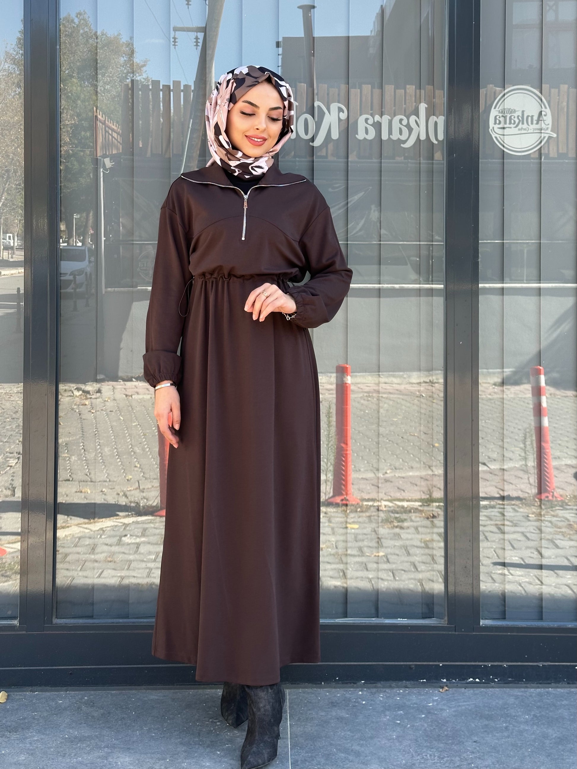 KAHVE KESİK DETAYLI FERMUAR YAKALI ELBİSE