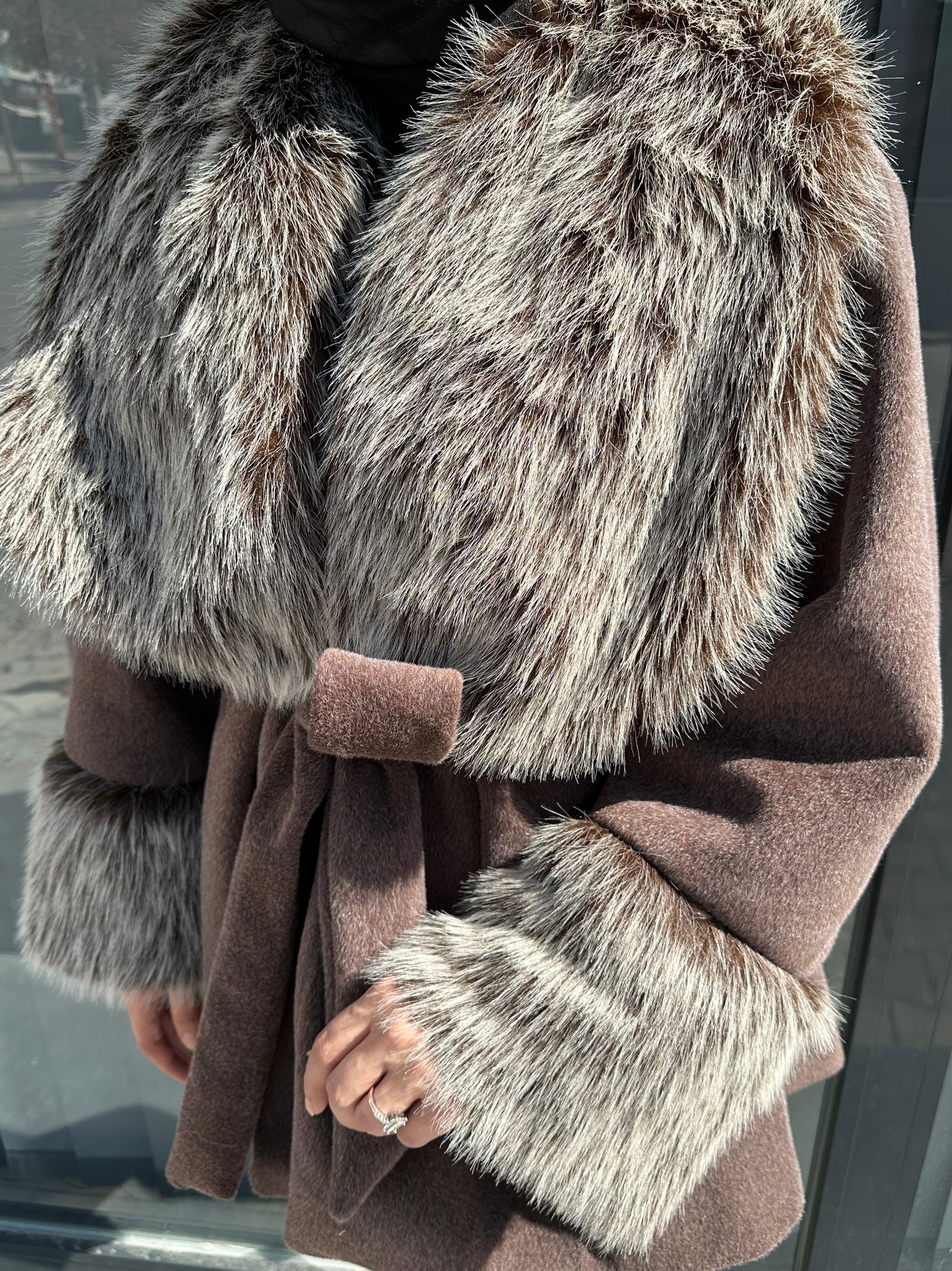KAHVE YAKASI VE MANŞET KÜRK DETAYLI MONT
