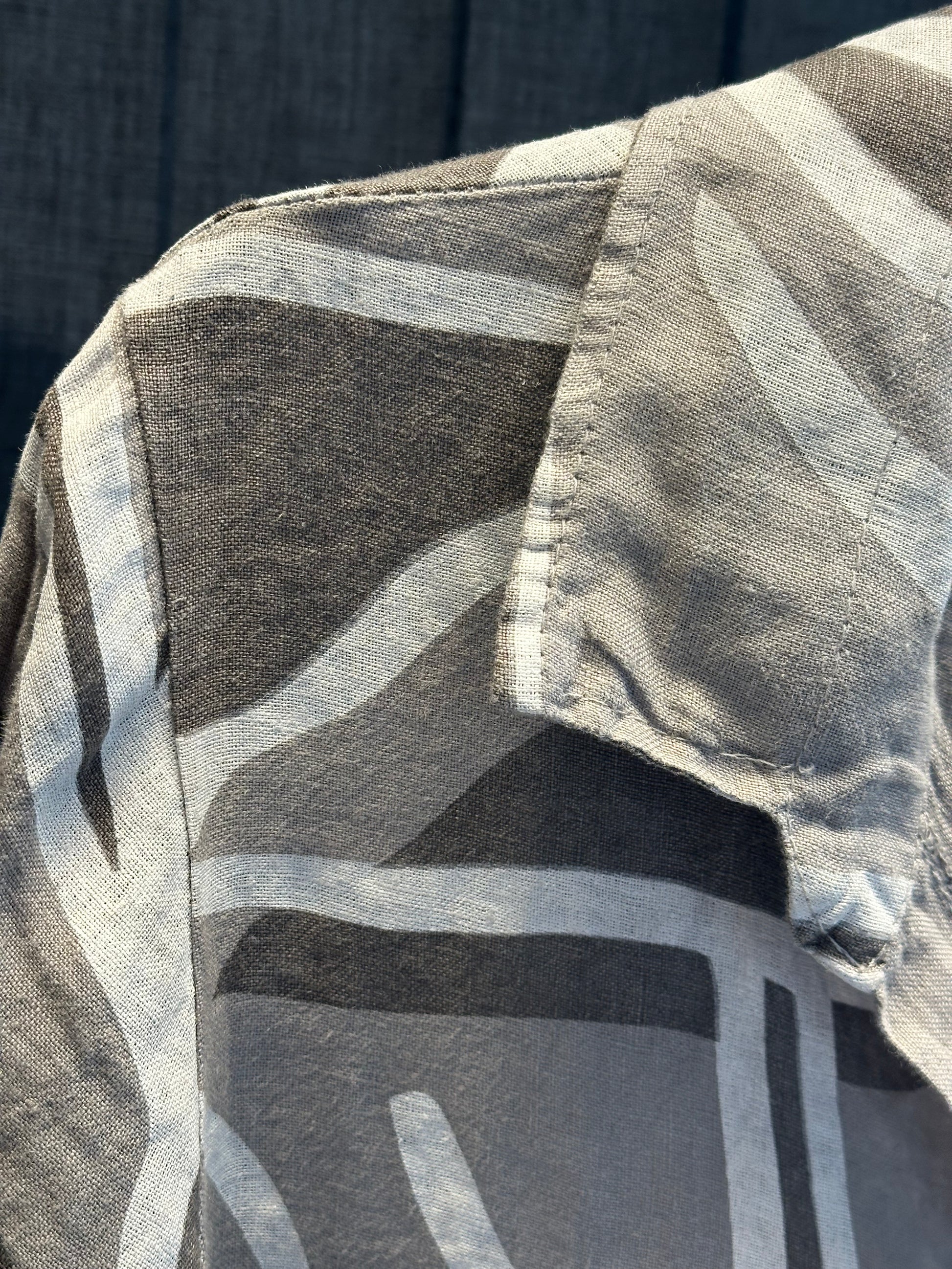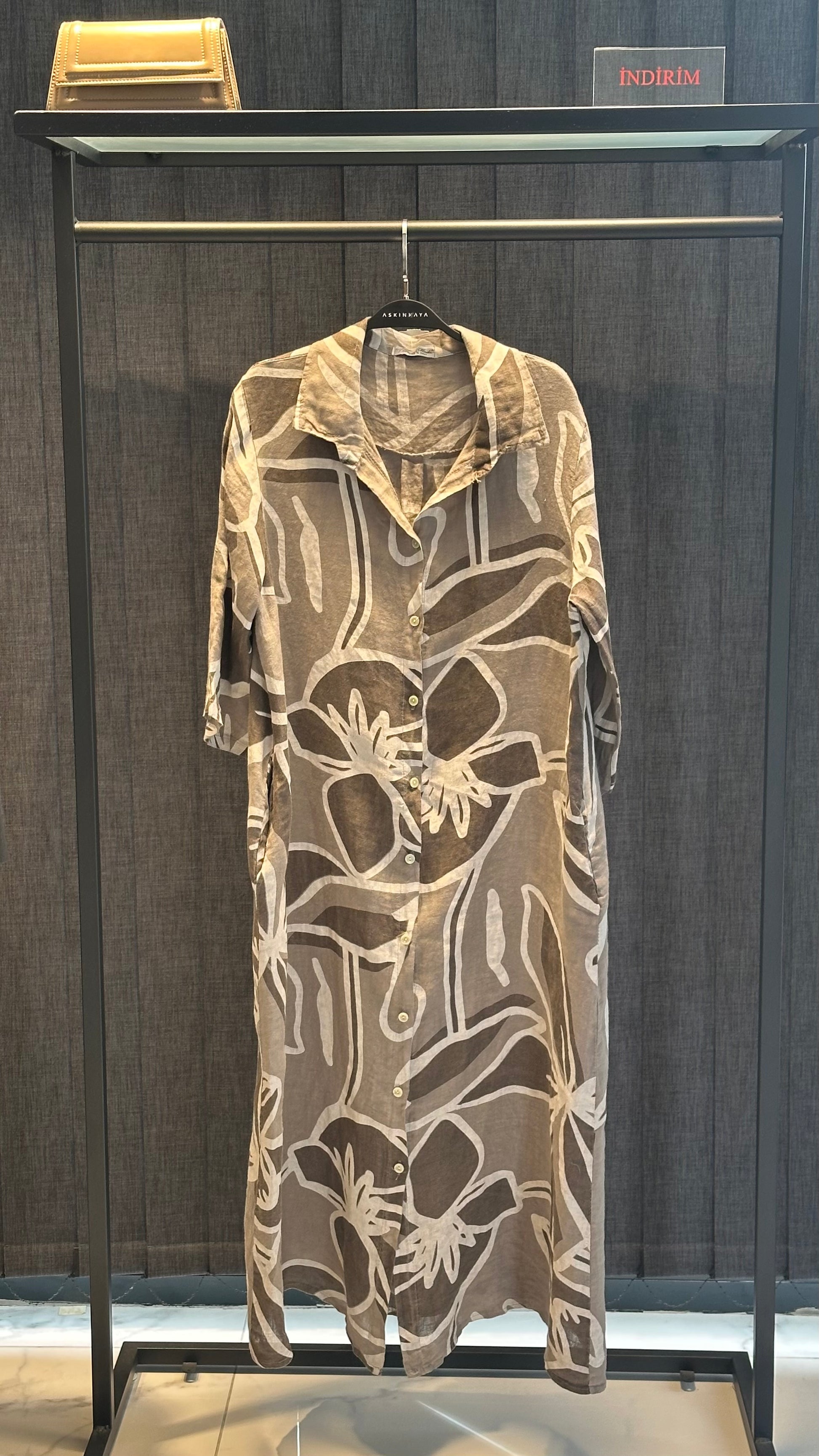 KAHVERENGİ TASARIM DESEN UZUN KETEN ELBİSE